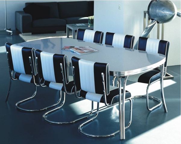 Die Familie lacht, es ertönt leises Rock’n’Roll aus dem Radio – und das Setting ist perfekt. Der Tisch dient nicht nur als funktionaler Mittelpunkt, sondern als stilvoller Blickfang. Gäste setzen sich, bewundern die Chromkanten und den geschmeidig glänzenden Tischplattenlack. Die geschwungenen Sitzgestelle der Stühle geben ein federndes Sitzgefühl – und der Retro-Charme ist allgegenwärtig.