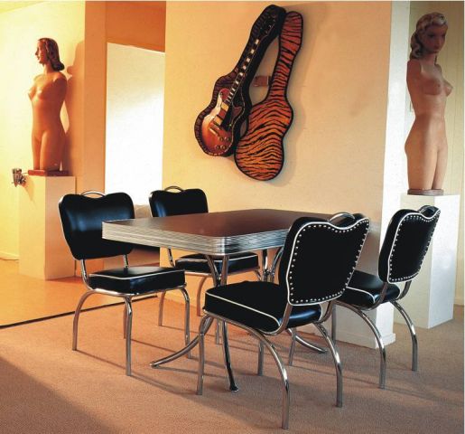 Die Kombination aus verchromten Rohren, glänzenden Oberflächen, kontrastierenden Farben und klassischen Details wie Chromgriffen und Ziernägeln sorgt für einen echten 50er-Jahre-Look – ideal für jedes Retro-Interieur oder Diner-Thema.